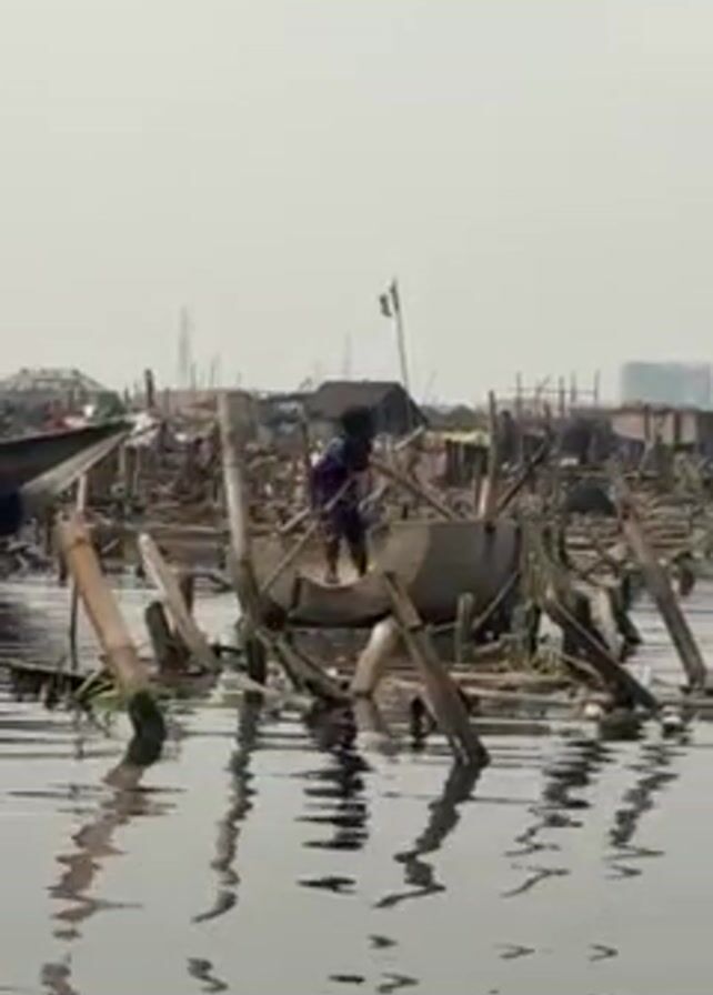 person standing in a makeshift boat on a body of water, possibly a lagoon or bayou, using a long pole to propel themselves. The boat appears to be constructed from a concrete basin and scrap wood. The surrounding environment is cluttered with debris, wooden structures, and what seems to be a shantytown or slum built on stilts over the water. In the distance, a modern building is visible. The sky is overcast, creating a muted and grey atmosphere. The water reflects the debris and the structures, adding to the chaotic appearance of the scene.