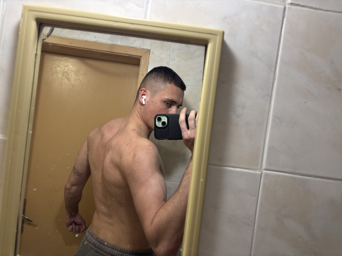 An image depicts a male individual taking a mirror selfie indoors, situated in Veliko Tarnovo, Bulgaria. The subject is shirtless, facing partially away from the viewer, with his back and right side visible. His left arm is bent, forming a clenched fist, displaying muscular definition and a tattoo of text on the bicep/tricep area. He holds a black smartphone in his right hand, positioning it to photograph his reflection in a rectangular mirror. A white wireless earbud is present in his left ear. The mirror has a light-colored frame, reflecting a beige door with a metallic handle. The wall adjacent to the mirror is composed of light-toned, square ceramic tiles with visible grout lines.
