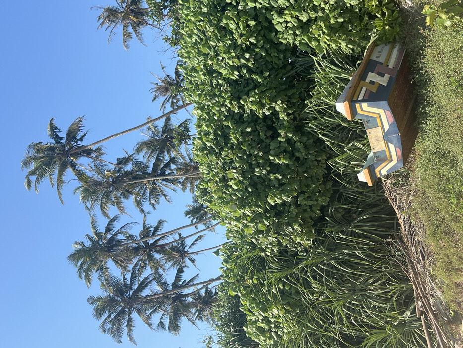 The image depicts a static outdoor scene in Polwathumodara, Sri Lanka, under a clear blue sky. In the foreground, a small, wooden, outrigger-style fishing boat rests on an upward-sloping patch of green grass and sparse brown earth. The visible portion of the boat is painted predominantly dark blue, with geometric patterns in yellow, white, and faded red. The text "Nil Manel" is discernible on its side. The boat is oriented with its stern facing towards the lower right of the frame, partially embedded in the slope, and slightly angled upwards. Behind the boat and filling the midground is dense, vibrant green vegetation. This vegetation consists of two primary layers: a lower layer of long, narrow, sword-like leaves, and an upper layer of bushy, broad-leafed foliage that extends upwards. Above this dense vegetation, against the clear, light blue sky, multiple tall coconut palm trees are visible, their dark green fronds spread out. The palm trees exhibit varying degrees of lean, characteristic of coastal growth. No individuals, animals, or discernible activities are present.