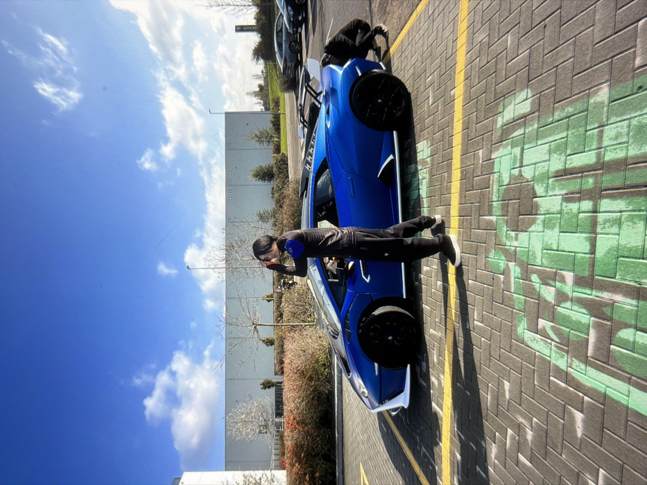 The scene captures a blue Lamborghini Huracán STO, identified by its aggressive styling, prominent rear wing, and black wheels with white accents, parked on a paved surface. A person with dark, medium-length hair, wearing a black long-sleeved shirt with a blue patch on the left shoulder, black track pants, and black slip-on shoes, stands to the left of the car. This individual faces partially left, with their head turned towards the camera, and their right hand raised near their forehead. A second person, dressed in dark clothing, is crouched near the rear right wheel of the Lamborghini, appearing to inspect or interact with the vehicle. The ground is paved with grey rectangular blocks, featuring yellow parking space lines and partially faded green spray paint markings. In the background, a large, utilitarian, grey industrial-style building stands under a clear blue sky dotted with white clouds. A strip of reddish-brown bushes and several bare, leafless trees separates the parking area from the building. To the right, additional vehicles are parked further away, and a white sign with the word "icon" partially visible points right. The overall environment suggests a commercial or industrial park, characteristic of areas found in the broader metropolitan region of Paris, France, rather than a dense urban center.