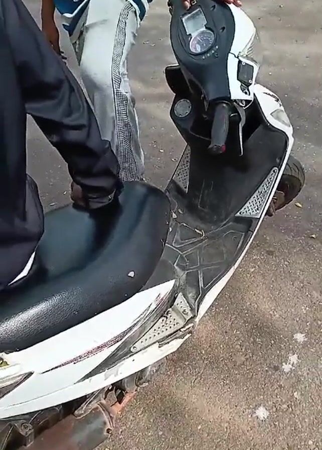 A person wearing a black jacket and sitting on a black scooter seat is visible. The scooter is white and black with red accents, and it appears to be damaged. The scooter's exhaust pipe is rusted. Another person wearing white patterned pants stands near the scooter. The ground is asphalt.