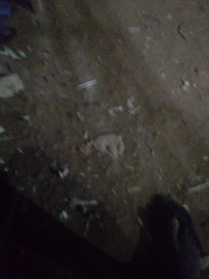 A grainy, dimly lit image reveals a cluttered floor. Debris, possibly paper or wood fragments, is scattered across the surface. Near the center, a small, light-colored animal, perhaps a cat or dog, lies prone. A dark object, possibly a shoe or piece of furniture, is partially visible in the foreground, obscuring the lower right corner. The overall scene has poor visibility due to low light and image quality.