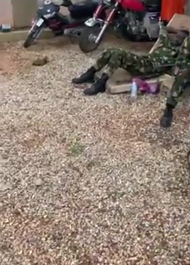 group of uniformed military personnel resting outdoors on a gravel surface near a small vehicle and several motorcycles. Some are lying down while others are seated. They appear to be taking a break in a casual environment.