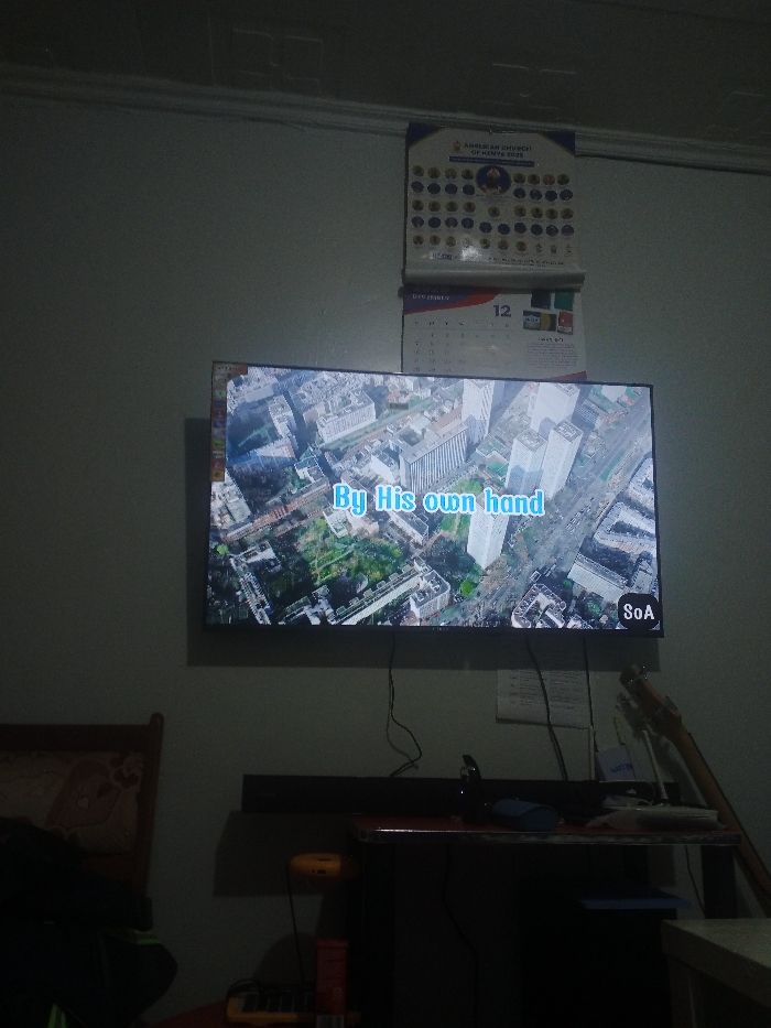 A wall-mounted TV displays a bird's-eye view of a city with text overlay reading "By His own hand" and "SoA" logo. Above the TV hangs a calendar, showing December 12, and a larger calendar with circular images. Below, a cluttered desk holds electronics, cables, and a guitar rests against the wall. To the left, a chair back is visible in the dim lighting.