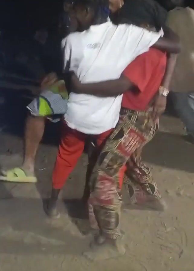 three people dancing closely in an outdoor setting, likely at night. One person is wearing a white shirt and red pants, another is wearing a red shirt and patterned pants, and the third is wearing green patterned shorts. They are all holding onto each other while moving, and the ground appears to be dirt or sand. Other people are standing in the background.