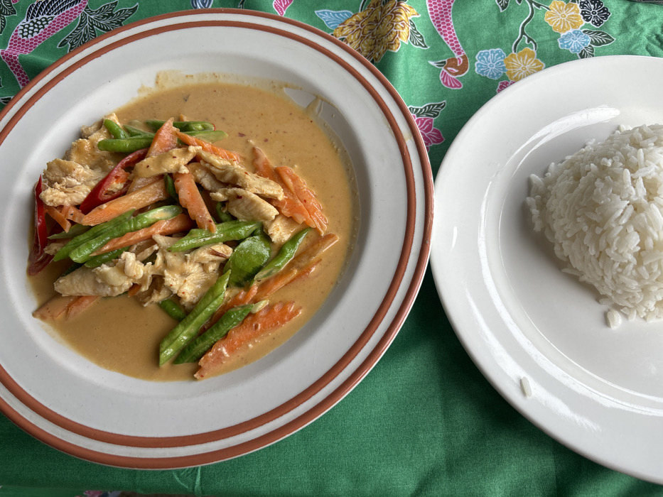 An overhead shot depicts two round ceramic plates on a green tablecloth with a patterned section, in Khlong Sok, Thailand. The top plate, featuring a brown and white striped rim, contains a dish of sliced chicken breast, green beans, and julienned carrots in a creamy orange-red curry sauce, garnished with red chili slices. The bottom plate, plain white, holds a mound of white cooked rice. No individuals, hands, or utensils are visible.