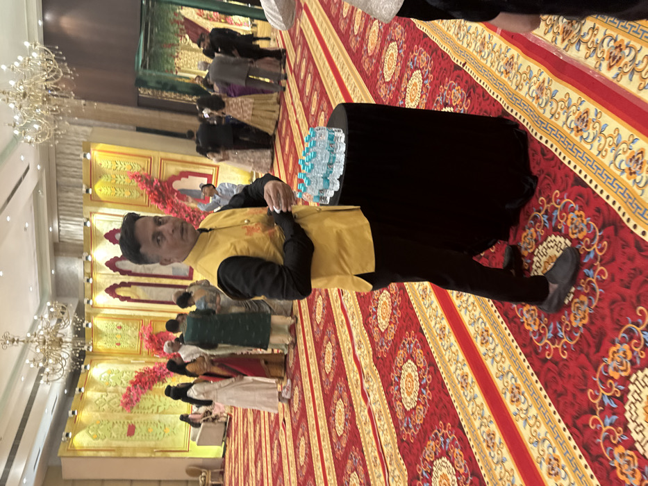A man stands on an ornate red and gold patterned carpet, wearing a black shirt, black pants, and a yellow vest. A black table draped with bottles of water is next to him. The background shows a large hall with gold-decorated walls and chandeliers. Several people in traditional attire are milling around, some lined up as if waiting. The scene likely depicts an event or gathering, potentially a wedding or celebration in an opulent setting.