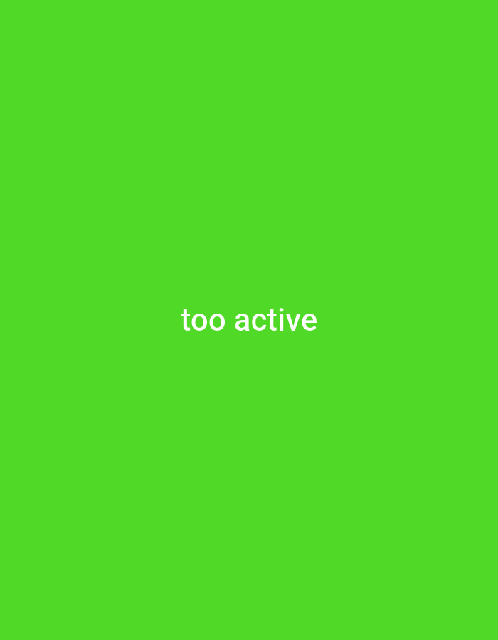 The image displays a solid, vibrant green background. Centered horizontally and vertically on this background is the white, sans-serif text "too active" in lowercase letters. The scene is an abstract digital graphic and does not depict a physical location within a city; therefore, a location in "Unknown, Unknown" cannot be identified from the image content. There are no individuals, physical subjects, or objects visible beyond the textual overlay. No actions or interactions are depicted. The environment is an unadorned, uniform digital plane.