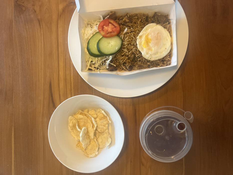 An overhead view captures a meal set on a polished wooden table, likely in Kerobokan, Indonesia. A white ceramic plate holds a white cardboard takeaway container filled with Nasi Goreng (fried rice), topped with a sunny-side-up fried egg, two slices of green cucumber, one slice of red tomato, and shredded white cabbage. To the left, a white ceramic bowl contains a quantity of light-colored, thin crackers (kerupuk). Below the bowl, a clear plastic tumbler with a lid and a red-tipped straw holds a dark liquid beverage. The scene depicts a prepared meal with no visible human presence or direct action.