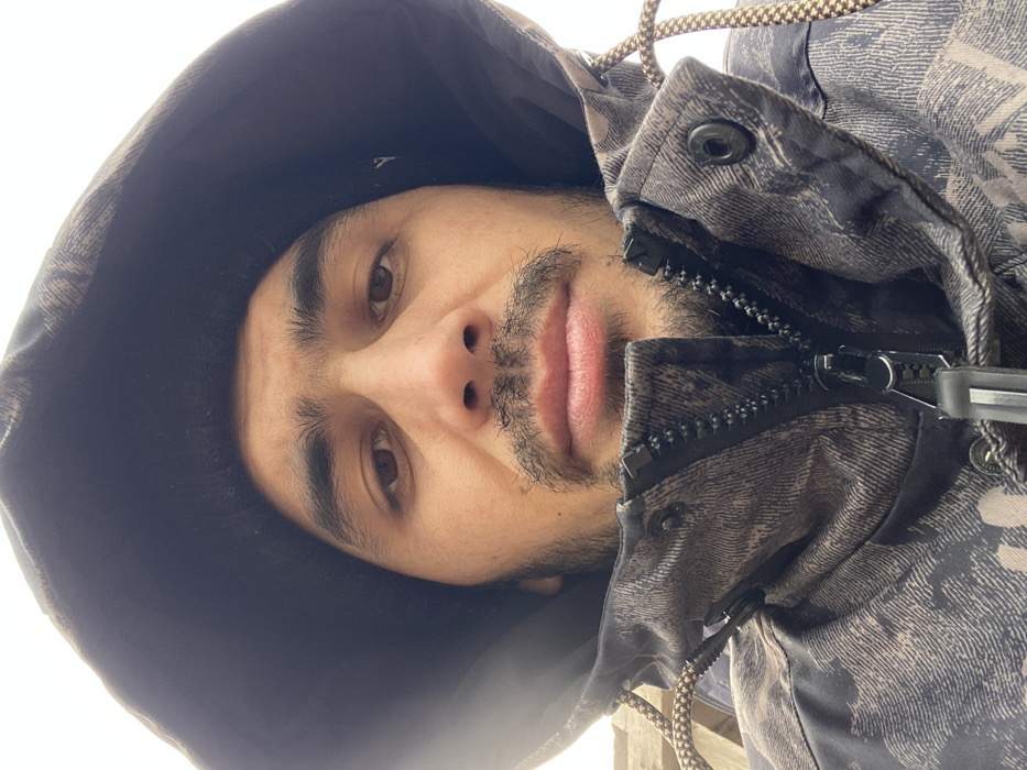 A person peers into the camera from a low angle, face framed by a dark hood. The individual has dark hair and eyes, with a visible mustache and beard. The person is wearing a mottled, gray and black jacket zipped up to the chin. The light is diffused and even, illuminating the face and jacket fabric. The overall impression is intimate and slightly unsettling due to the unusual angle.