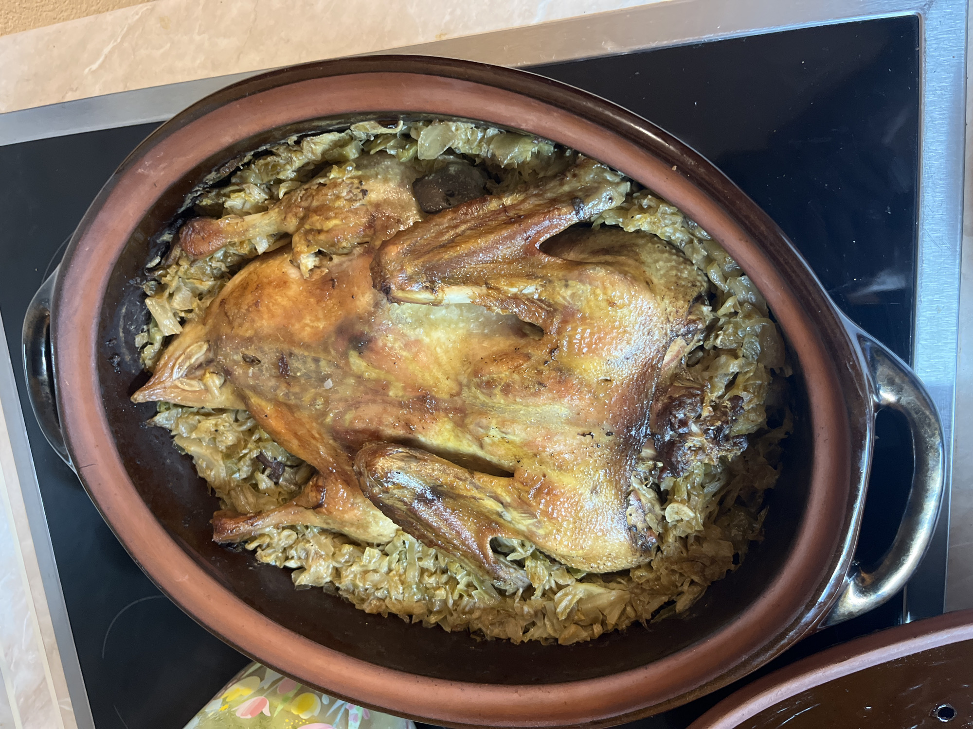 - "A high-angle, close-up shot shows a whole cooked duck surrounded by cooked cabbage in a dark brown, ceramic, oval-shaped baking dish" by FM-XwS7W2, licensed under CC BY 4.0