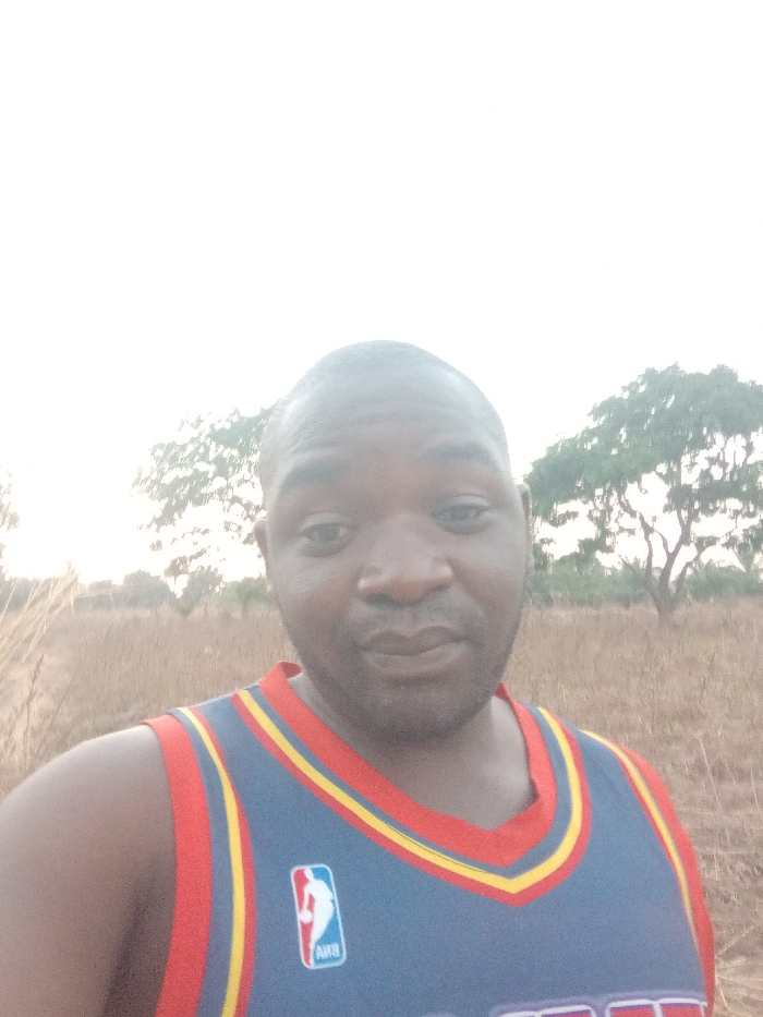 A male individual with a dark complexion, shaved head, and short facial hair is depicted in a chest-up, forward-facing shot. He is wearing a blue sleeveless basketball jersey with red and yellow trim, featuring the white NBA logo and "BHV" text on the left chest. The subject maintains direct eye contact with the camera, displaying a neutral to slight smiling expression. The background, set in Gudi, Nigeria, consists of an open, outdoor area with dry, yellowish-brown ground covered by sparse vegetation. Two trees, one prominent with green foliage to the right and another partially visible to the left, are present against an overexposed, light-colored sky.