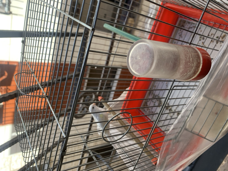 A black metal wire bird cage is depicted in the city of Ma'raba, Syria. Inside the cage, a single white bird, exhibiting a yellow patch on its left side and possessing a light orange beak, is perched on a horizontal wooden dowel. The cage's base features a red plastic tray, containing scattered birdseed and other debris. A clear plastic water feeder with a red cap is attached vertically to the cage bars on the right side. A section of a green plastic object is partially visible within the cage's right rear quadrant. A transparent plastic sheet or cover is draped across the lower front exterior of the cage. The background reveals dark metal bars, likely a railing, situated in front of an orange-brown textured wall and other lighter-colored building elements, illuminated by daylight.
