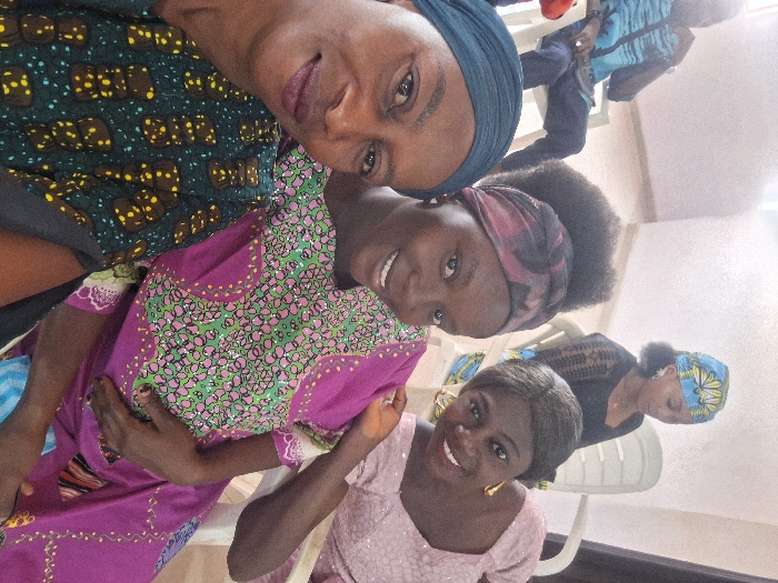 The image depicts an indoor gathering of five individuals in Yelwa, Nigeria