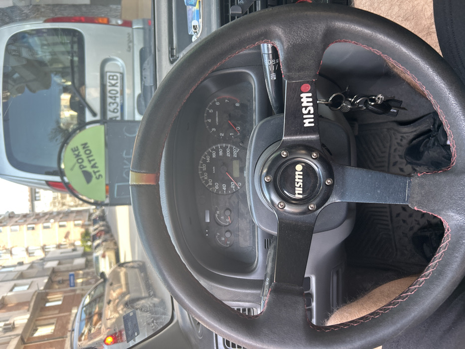 The image depicts a first-person view from the driver's seat of a stationary vehicle on an urban street in Plovdiv, Bulgaria. The central object in the foreground is a black aftermarket three-spoke steering wheel featuring a "Nismo" branded horn button and a Nismo branded tag hanging below it, from which a set of keys is suspended. The steering wheel rim is wrapped in black material with red contrast stitching, and a small segment at the top displays gold and red stripes. Behind the steering wheel, the vehicle's instrument cluster is visible, showing a speedometer, tachometer, fuel gauge, and temperature gauge. The needles indicate a dormant state. A driver's forearm and upper leg are partially visible on the right side of the frame. Black trousers and black shoes on black, textured floor mats are visible on the floorboard. Beyond the windshield, a light grey or silver van is positioned directly ahead. A Bulgarian license plate, "A 6340 KB," is affixed to its rear. Attached to a stand or structure behind the van is a semi-circular green sign displaying a white bowl icon and the text "POKE STATION." Below this, part of another dark sign is visible but illegible. To the left, another silver sedan is partially visible in traffic or parked. Further down the street, additional parked cars line the curb. Multi-story residential or commercial buildings with numerous windows and balconies line both sides of the street in the background. The scene is illuminated by daylight, suggesting clear weather conditions. The street appears to be a standard urban thoroughfare.