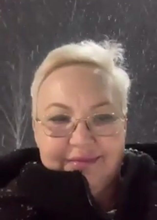 A woman with short, light blonde hair and glasses is facing the camera in a close-up shot. She is wearing a black jacket. It is snowing heavily, and the snow is visible against a dark background. Some bare tree branches can be seen in the background. The woman is smiling slightly.