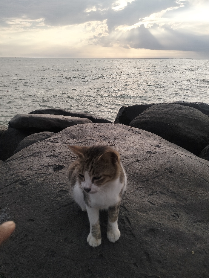 A cat stands on a rock near the ocean. The feline is predominantly white with patches of grey and brown fur. The ocean stretches to the horizon, reflecting the cloudy sky. Light breaks through the clouds, creating a bright spot on the horizon. In the foreground, other large rocks surround the one the cat occupies. A finger is slightly visible on the lower left of the image.