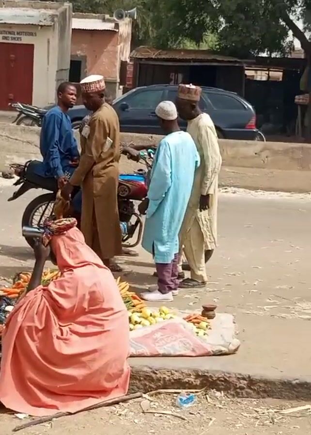 street scene in what appears to be a small town in Africa, possibly Nigeria. A woman wearing a long, peach-colored robe and head covering is sitting on the ground next to a pile of vegetables, including carrots, green beans, and white onions. Several men stand or sit around her, presumably engaging in commerce. Some of the men are wearing traditional Muslim attire, including white caps. One man is on a motorcycle. Other men are dressed in casual clothing. The street is unpaved and dusty. In the background, there are small buildings, some of which appear to be shops or businesses. One building has the words "EDUCATIONAL MATERIALS AND SHOES" printed on it. Other vehicles, including cars and motorcycles, are visible in the background. Some people are looking at their phones. There are trees along the roadside. The overall impression is of a bustling, informal marketplace.