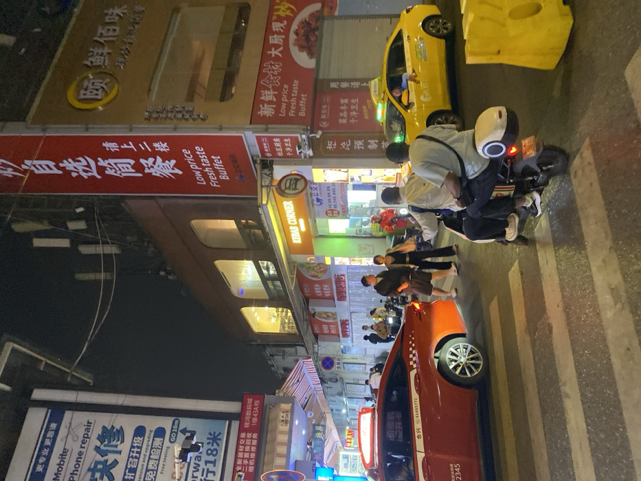 This image depicts a nighttime street scene in Yuexiu District, China, characterized by commercial activity and vehicle traffic. In the foreground, a white and black electric scooter carries two male riders, facing away from the viewer, positioned on a white-striped pedestrian crosswalk. The rear rider wears a light grey t-shirt and dark pants, with a black shoulder bag. To the left, the rear section of a red Guangzhou Xingxian taxi, marked with white checkered patterns and license plate details (ending "2345"), is visible, indicating movement from left to right. To the right, a yellow GAC Group taxi is stopped or moving slowly, with the driver's arm resting on the open window. Yellow plastic road barriers are visible on the far right. The midground features several pedestrians on the sidewalk. Prominently, a group of three individuals stands near the curb between the red and yellow taxis; a man in a dark hoodie and shorts stands next to a woman in a dark top and skirt. The street is lined with multi-story commercial buildings. A large vertical red sign on the right building advertises a "Low price Fresh taste Buffet" (炒自选简餐), directing customers to the second floor. Below this, an orange-backed "KEBAB CORNER" sign is visible. Another horizontal red sign below Kebab Corner also advertises "Low price Fresh taste Buffet." On the left, a tall blue and white vertical sign advertises "Mobile Phone repair" (快修) with directional text "GO 18M." Numerous other smaller signs, awnings, and illuminated storefronts are present along both sides of the street. The background reveals more urban buildings and a dark night sky. Overhead utility wires crisscross the space between buildings. The entire scene is brightly illuminated by artificial lights from storefronts, streetlights, and vehicle headlights, with reflections visible on the damp asphalt road.