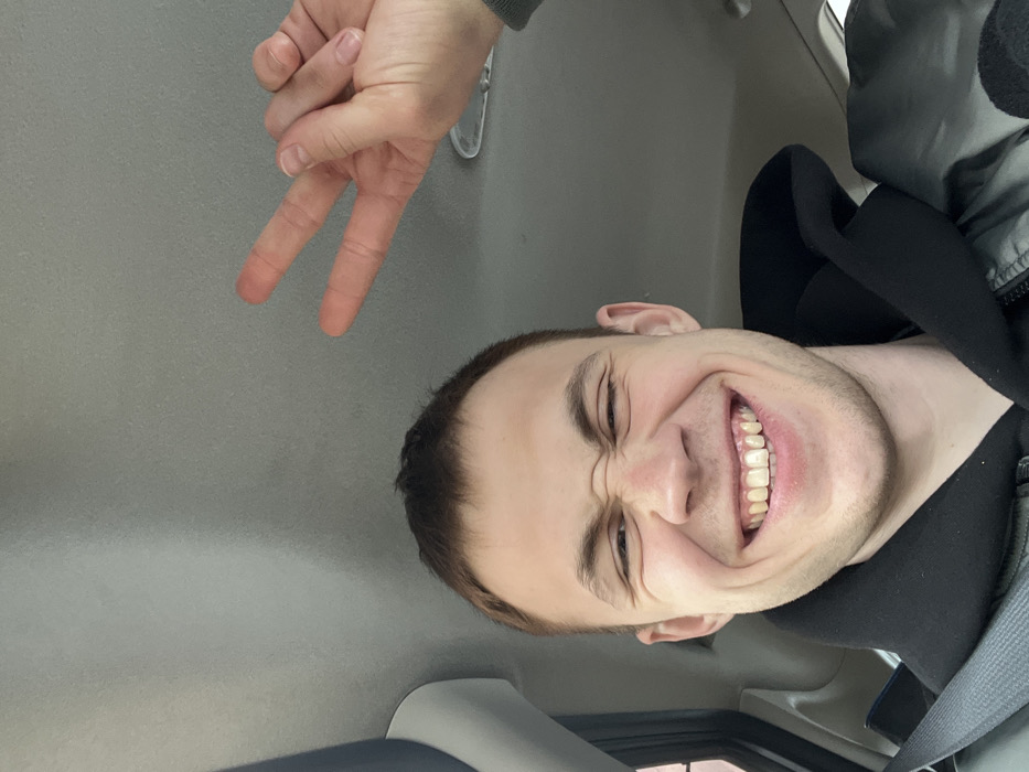 A single young adult male is captured in a selfie-style photograph from inside a vehicle in an unknown city. The male, with short brown hair and light skin, is positioned in the lower portion of the frame, displaying a wide smile with squinted eyes and a wrinkled nose. He is wearing a dark hooded garment underneath a dark, possibly reflective, jacket, with a seatbelt visible across his left shoulder. His right hand, extended into the upper right corner of the frame, performs a peace sign gesture. The background consists of the light grey headliner and a dark grey interior pillar of a car.