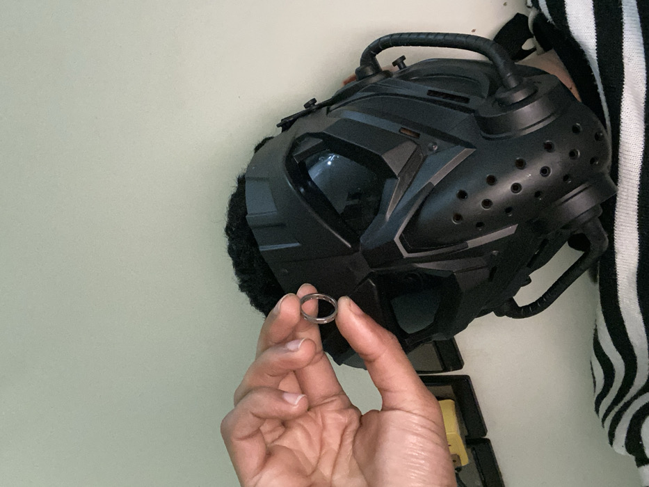 A dark, futuristic helmet with tubing and visible lenses is positioned near a hand holding a silver ring