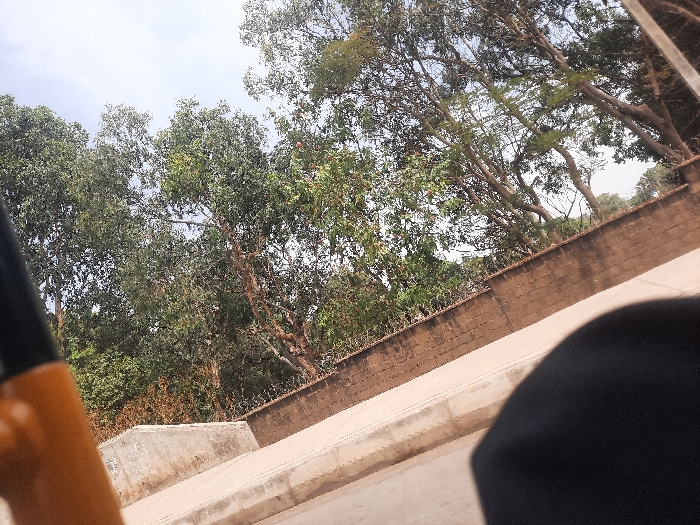 The image captures an outdoor scene in Jos, Nigeria, under a bright sky. In the immediate foreground, a partial black and orange object is visible on the lower left, while a blurry dark, curved shape occupies the lower right. The midground features a light-colored paved surface that slopes diagonally downwards from left to right, bordered by a concrete curb on its left side. Behind this, a brown brick wall, topped with a security feature resembling barbed or razor wire, extends across the frame, also sloping downwards. The background is dominated by numerous tall trees with dense green foliage and visible brown trunks, creating a lush canopy. A light blue sky with scattered white clouds is visible above and through the tree cover. Patches of dry, brownish vegetation are discernible below the main tree line. No individuals, specific actions, or interactions are present in the frame.