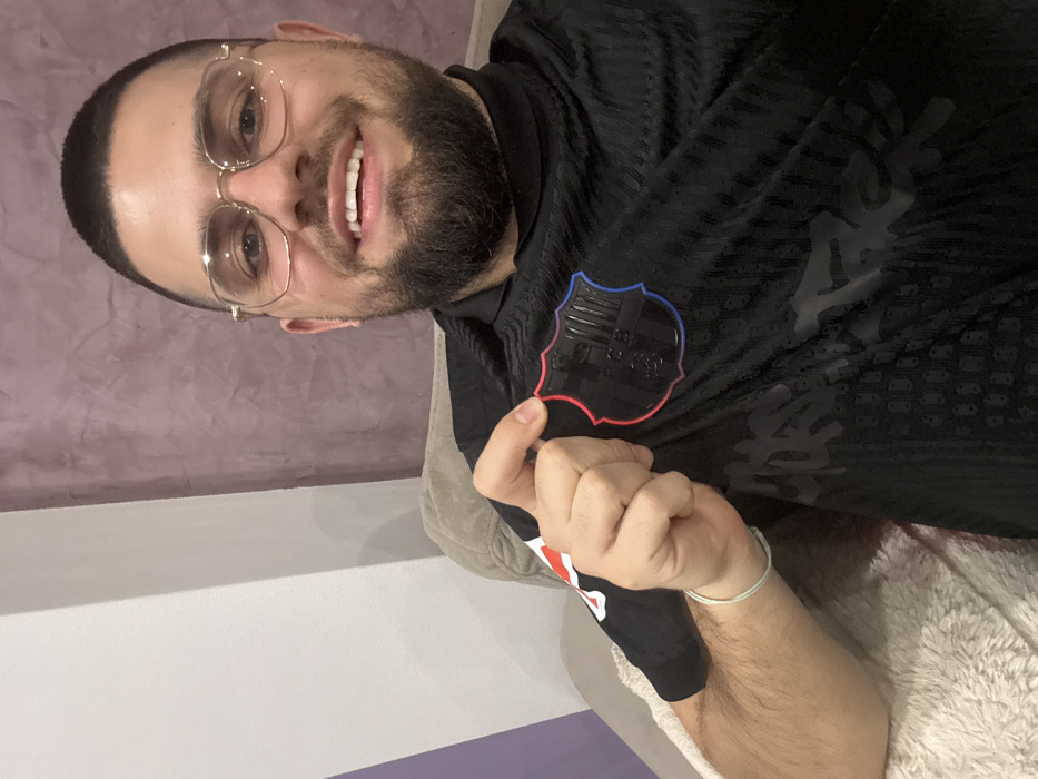 A young adult male, with a short buzz cut, full beard, and clear-framed eyeglasses, is seated in what appears to be a residential interior in Sofia, Bulgaria. He is smiling broadly, looking directly at the camera. The male is wearing a black collared sports jersey featuring a subtle textured pattern and an embossed or printed design on the chest. His right hand holds up a black, shield-shaped FC Barcelona crest emblem on the jersey, which has a red outline transitioning to blue. A light blue wristband is visible on his left wrist, and a red and white pattern is partially visible on the left sleeve of his jersey. He is seated on a light brown upholstered sofa or armchair, with a cream-colored, textured throw blanket draped beside him. The background consists of a white wall segment to his left (viewer's right) and a textured, matte purple/mauve wall segment to his right (viewer's left).