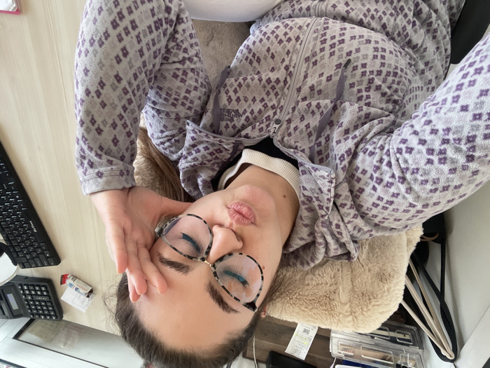 In Isperih, Bulgaria, a female individual is depicted in a close-up, selfie-style photograph, seated at a light-colored desk within an indoor environment. She has dark hair, which is pulled back, and wears patterned, cat-eye glasses. Her attire consists of a grey and purple patterned fleece hoodie with a partial zipper and hood, worn over a black top with a visible white collar band. Her lips are pursed into a pout, and her eyes appear closed or squinting behind her glasses. Her left hand is positioned against her forehead, with her fingers splayed. The desk surface to her right features a black computer keyboard, a black calculator, and a crumpled paper item, possibly a receipt. Behind her, part of a beige faux-shearling office chair back is visible, along with a clear acrylic desk organizer containing documents and a dark strap, possibly from a handbag, hanging from the chair or desk.