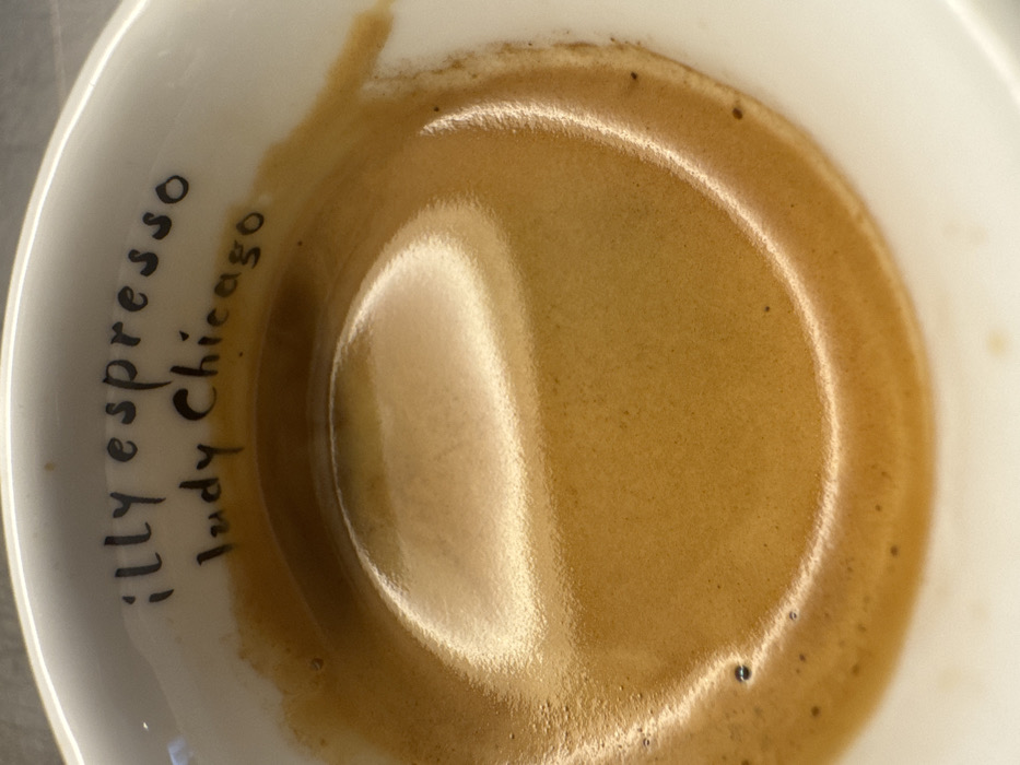 The image displays an overhead view of a white ceramic espresso cup, located in Andratx, Spain. The cup contains espresso, characterized by a rich, reddish-brown crema surface that reflects an overhead light source. Inscribed in black script on the interior rim of the cup are the words "illy espresso" on the upper line and "Judy Chicago" on the line below. No individuals, specific actions, or interactions are visible within the frame.