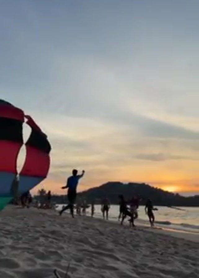 At sunset on a beach, a group of people prepare a parasailer for flight. The parasail is large and multicolored. A group of men on the beach pull the ropes and raise it. In the background, a man is seen taking a photo with his phone as the parasailer lifts off. The sun is setting over a landmass in the distance, casting a warm glow.