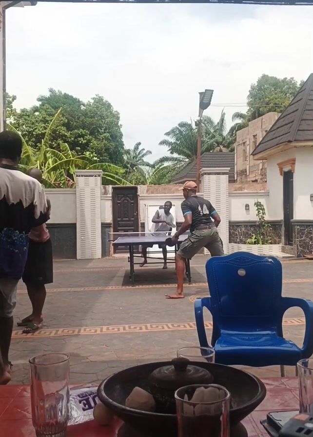 From an indoor vantage point, a scene unfolds of three individuals and a table tennis game. Two men are actively engaged in a game of table tennis on a black table with a net; one wears a white shirt, while the other sports a black shirt with the number 14 emblazoned on the back, along with grey shorts and a peach-colored cap. The third individual, clad in a patterned shirt and grey shorts, stands as a spectator. The table tennis game is situated on a paved outdoor terrace, encased by a white wall and gate. A house featuring a brown roof is visible in the background. In the foreground, within the room, a red table is adorned with glasses and a decorative bowl containing various items, including stones and a teapot. A blue plastic chair rests beside the table, and above, the scene is framed by a corrugated roof.
