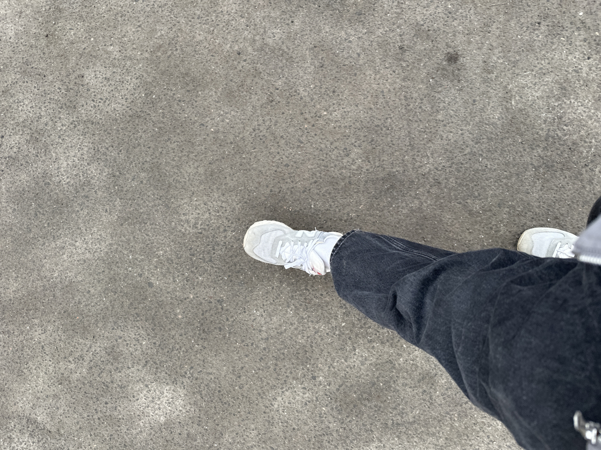 The image depicts a first-person, top-down perspective of a person's lower body in motion on a grey, aggregate-textured paved surface