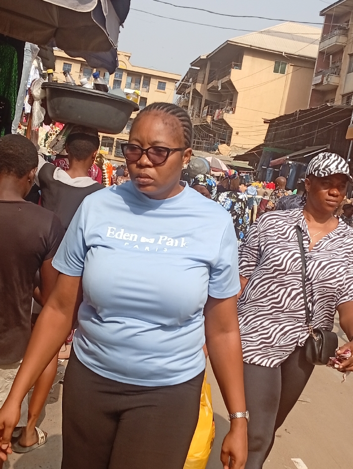 The scene depicts a bustling outdoor market street in Fegge, Nigeria, under bright daylight. In the foreground, an adult female is positioned left of center, wearing a light blue short-sleeved t-shirt with "Eden Park PARIS" branding, dark-colored pants, dark-rimmed eyeglasses, and a silver-colored wristwatch on her left wrist. Her hair is styled in braids. She is walking to the viewer's left, with a yellow bag or object in her left hand, and her gaze directed slightly to her left. To her right, a second adult female walks in the same direction, dressed in a black and white zebra-striped short-sleeved shirt and a black and white patterned cap, carrying a black cross-body bag. Directly behind the foreground subject, a third individual is visible from the back, carrying a black basin containing several bottles on their head. The background shows a crowded urban environment characteristic of a market. Numerous indistinct pedestrians are visible. Market stalls displaying various goods, including clothing, line the thoroughfare. Multi-story buildings with light-colored facades and visible balconies form the architectural backdrop. Overhead, utility lines are present against a clear sky, and a blue and white striped awning extends from a stall on the left side of the frame.