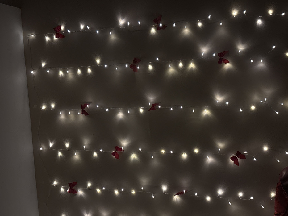 The image displays an indoor wall surface, primarily illuminated by an arrangement of vertical string lights
