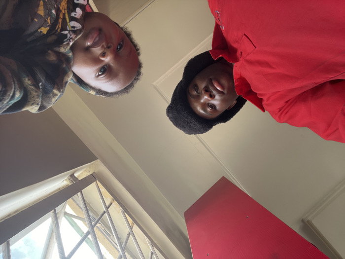 This image captures two individuals indoors in the city of Jos, Nigeria, viewed from a low-angle perspective looking upward