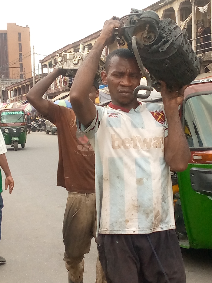 A street scene in Aba, Nigeria, depicts two men transporting goods manually on a paved city street. The primary subject, positioned in the foreground and slightly right of center, is an adult male with dark skin. He wears a soiled light blue and white striped short-sleeved football jersey featuring "umbro," a West Ham United crest, and "betway" branding. He carries a large, dark, metallic or plastic object resembling an engine component or compressor unit on his head, supporting it with both raised hands. His gaze is directed forward, towards the observer. Behind and slightly to the left, a second adult male in a brown short-sleeved t-shirt and dirty light-colored trousers also transports an object on his head, held by his raised arms; this object is mostly obscured. A third individual's arm, clad in a white shirt with green trim, is partially visible on the far left. The background shows a paved street with a green and black motorized tricycle (Keke Napep) moving away from the viewer on the left. Multi-story buildings line the street; one older structure displays intricate decorative elements along its upper facade, and a taller, modern brown building is visible further back. Distant vehicles and general street activity are present under an overcast sky.