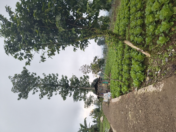 A rural landscape features a field of leafy green crops, possibly lettuce or cabbage, adjacent to a narrow dirt road. Tall trees with dense foliage frame the scene, partially obscuring a small, simple shack-like structure. The sky is overcast, creating soft, diffused lighting. The area appears to be a cultivated agricultural space with elements of nature and simple construction.