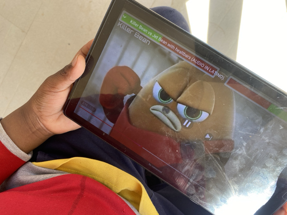 A dark-skinned right hand holds a black tablet computer, angled downwards. The hand rests with the thumb over the top right bezel of the tablet. The individual is wearing a red shirt with a grey and white striped collar, layered over a yellow garment, and dark blue trousers. The tablet screen is active, displaying a paused video titled "Killer Bean vs Jet Bean with healthbars (AUDIO IN LATINO)". The visible video frame features an animated character with a light brown, bean-shaped head, large green eyes, and a red head covering. A video progress indicator shows "2:15 / 5:53" along with a pause icon and a red progress bar. Below the title, a red and green segmented bar is visible, consistent with "healthbars". Faint text "No connection" is discernable on the upper left portion of the screen. The screen surface shows visible smudges and light scratches. The background consists of a light-colored surface, likely a floor, illuminated by direct natural light, casting a shadow from the tablet and hand. The location in the city of Nabatum, Nigeria, cannot be determined from the visual evidence provided in the image.