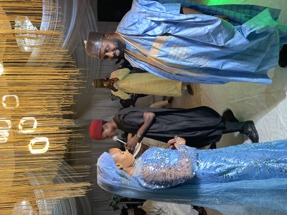 A bride in a blue dress and veil looks upwards at a man in a black robe and red cap who is holding a microphone. Another man in a patterned blue robe and cap looks towards them. A third man in a yellow robe and cap stands behind the speaker. The scene is decorated with hanging strands of golden lights and fabric. Other people are visible in the background.