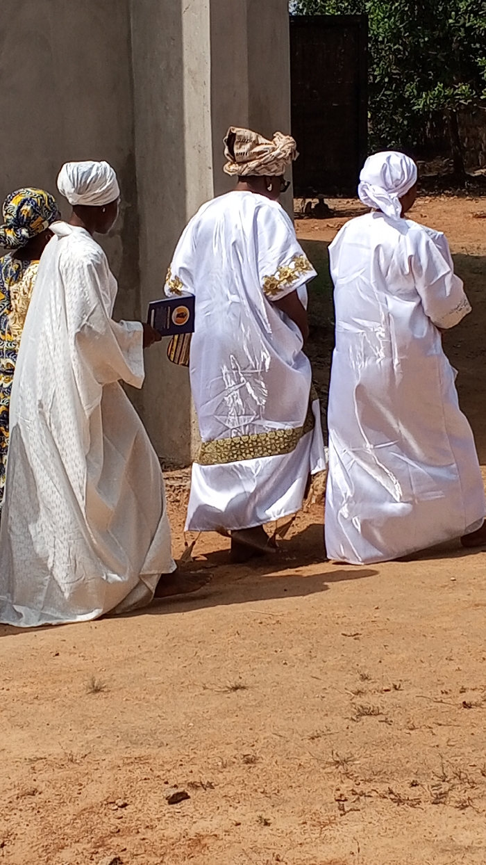 Four individuals, primarily observed from the back and side, are depicted walking on dry, reddish-brown earth with sparse vegetation, in what appears to be an outdoor setting in Egbedi, Nigeria. A light grey concrete structure is visible to the left, and dark green foliage in the background to the right. The lighting suggests a bright, sunny day. From left to right: 1. A person partially visible, wearing a colorful patterned headwrap in blue, yellow, and black. 2. A person in a white headwrap and a long, white, textured garment. This individual holds a small, dark blue rectangular object with a circular emblem in their right hand, extended forward. 3. A person wearing a light brown and beige patterned headwrap, dark sunglasses, and a long white garment featuring gold embroidery on the sleeves and a decorative gold pattern on the lower hem. Bare feet are visible. 4. A person in a plain white headwrap and a long, flowing white garment. Bare feet are visible. The individuals appear to be moving towards the right side of the frame.
