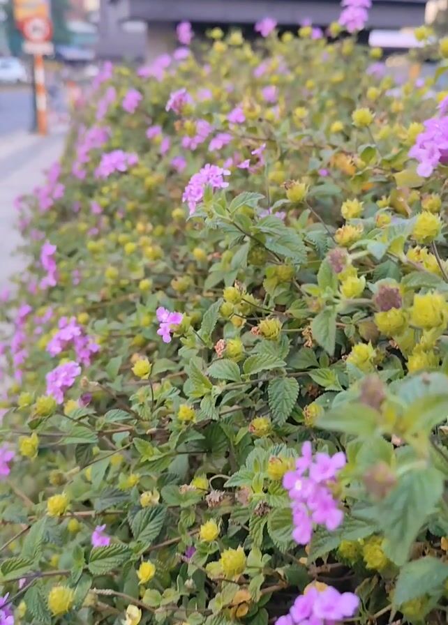 close-up view of a dense bush with small, purple flowers and green leaves. The bush appears to be located on the side of a street. A sidewalk, a street with blurry cars, and a traffic sign can be seen in the background, suggesting an urban environment. The focus is mainly on the flowers and leaves of the bush.