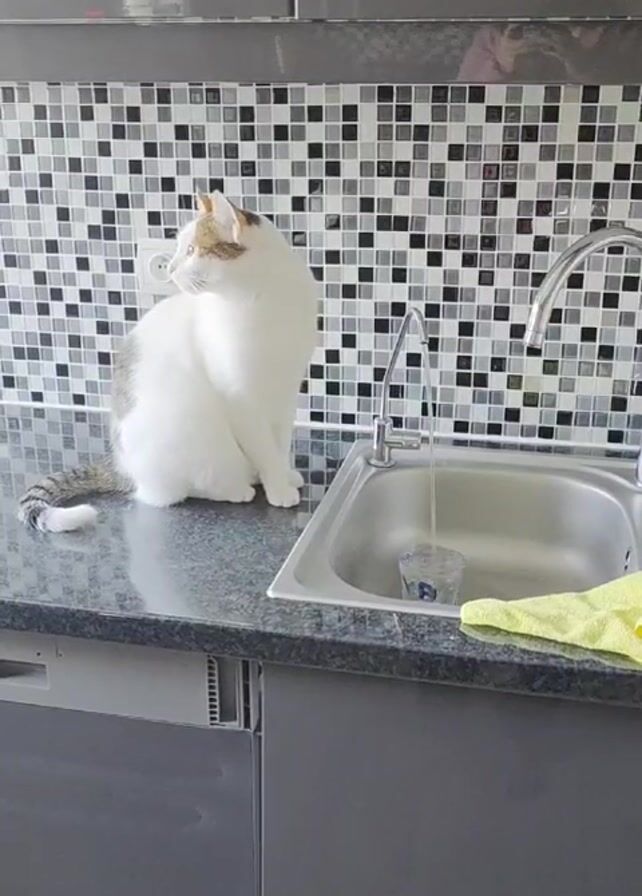A domestic long-haired cat is sitting on a kitchen countertop next to a sink. The cat is mostly white with a striped tail and small brown markings on its head. The sink has a metal faucet and a glass is being filled with water. Next to the sink there is a yellow cloth. The countertop is grey, and below it there are closed grey kitchen cabinets. The wall behind the sink has a black and white mosaic tile backsplash. There is an electrical outlet visible on the backsplash.