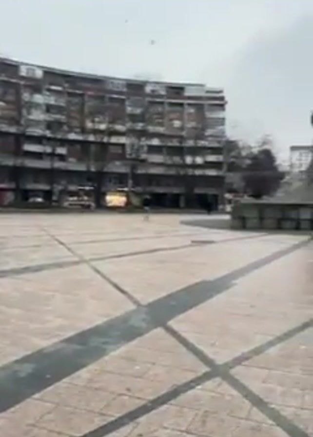 The video presents a view of a spacious, open plaza area on an overcast day