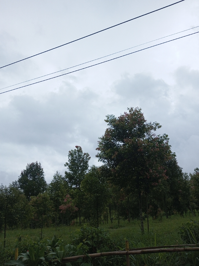 The image displays an outdoor scene in Ciherang, Indonesia, under an overcast sky. The upper third of the frame shows a light grey, uniformly cloudy sky. Two dark, parallel utility lines traverse horizontally across the upper portion of the frame; the upper line appears thicker. Below the utility lines, a dense arrangement of numerous trees dominates the midground, characterized by dark green foliage with noticeable reddish-brown clusters on some crowns, suggesting new growth or a specific species. The trees are varied in height and appear to be part of a cultivated plantation. The foreground contains abundant green ground cover, including grasses and smaller plants. A horizontal wooden pole or rail is partially visible at the bottom edge of the frame, indicating a low barrier. No human subjects, animals, or additional structures are visible within the frame.