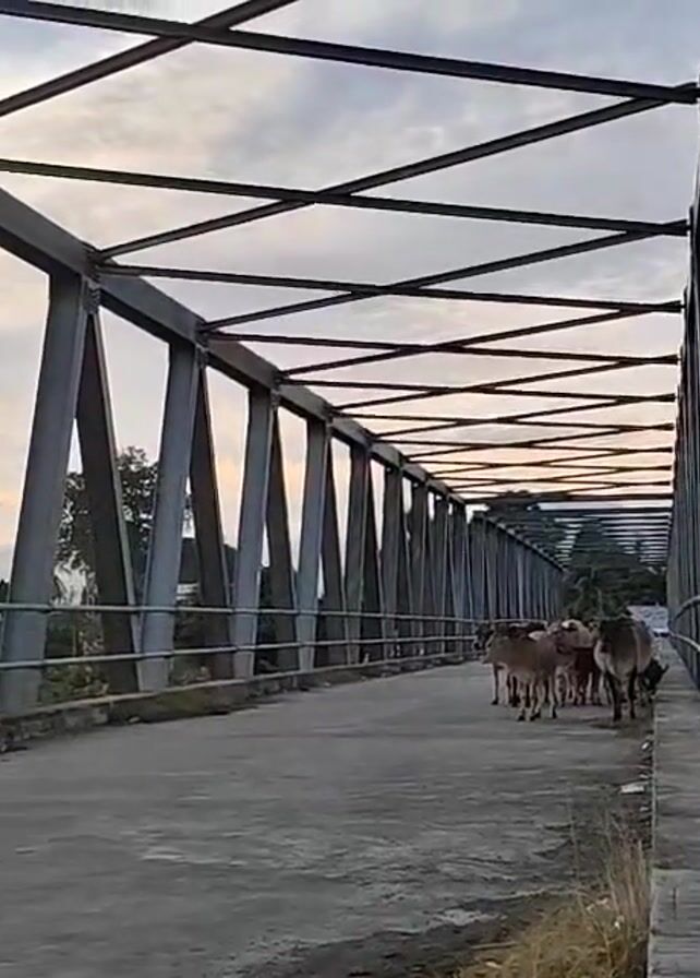 group of cattle crossing a metal truss bridge. The bridge has gray metal supports in a triangular pattern, connected by crossbars. The sky is visible through the bridge structure, showing light clouds at sunrise or sunset. In the background, beyond the bridge's edge, a mosque's dome and minaret can be seen amongst the trees. The cows are walking towards the viewer, on the bridge's concrete road surface. There are metal railings on both sides of the bridge. The bridge is situated in a rural setting.