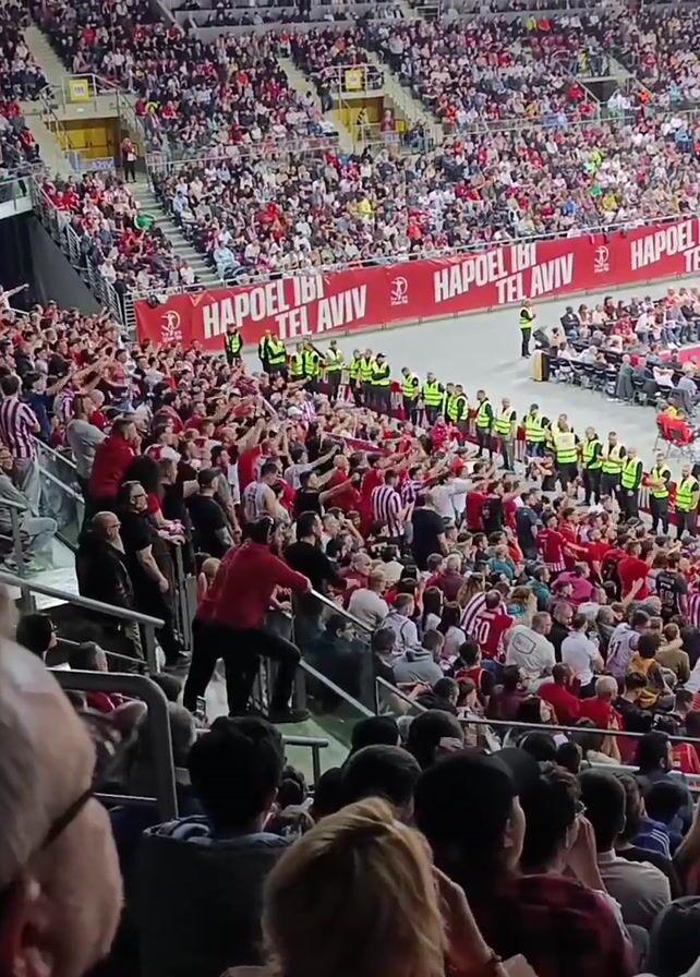 The video depicts a large crowd of people at a basketball game. The crowd is densely packed in the stands, with many wearing red and white, likely supporting one of the teams. A line of security personnel in yellow vests separates the crowd from the court. The basketball court is visible in the background. The environment is a large indoor stadium filled with spectators. The crowd appears to be enthusiastic and engaged in the game.