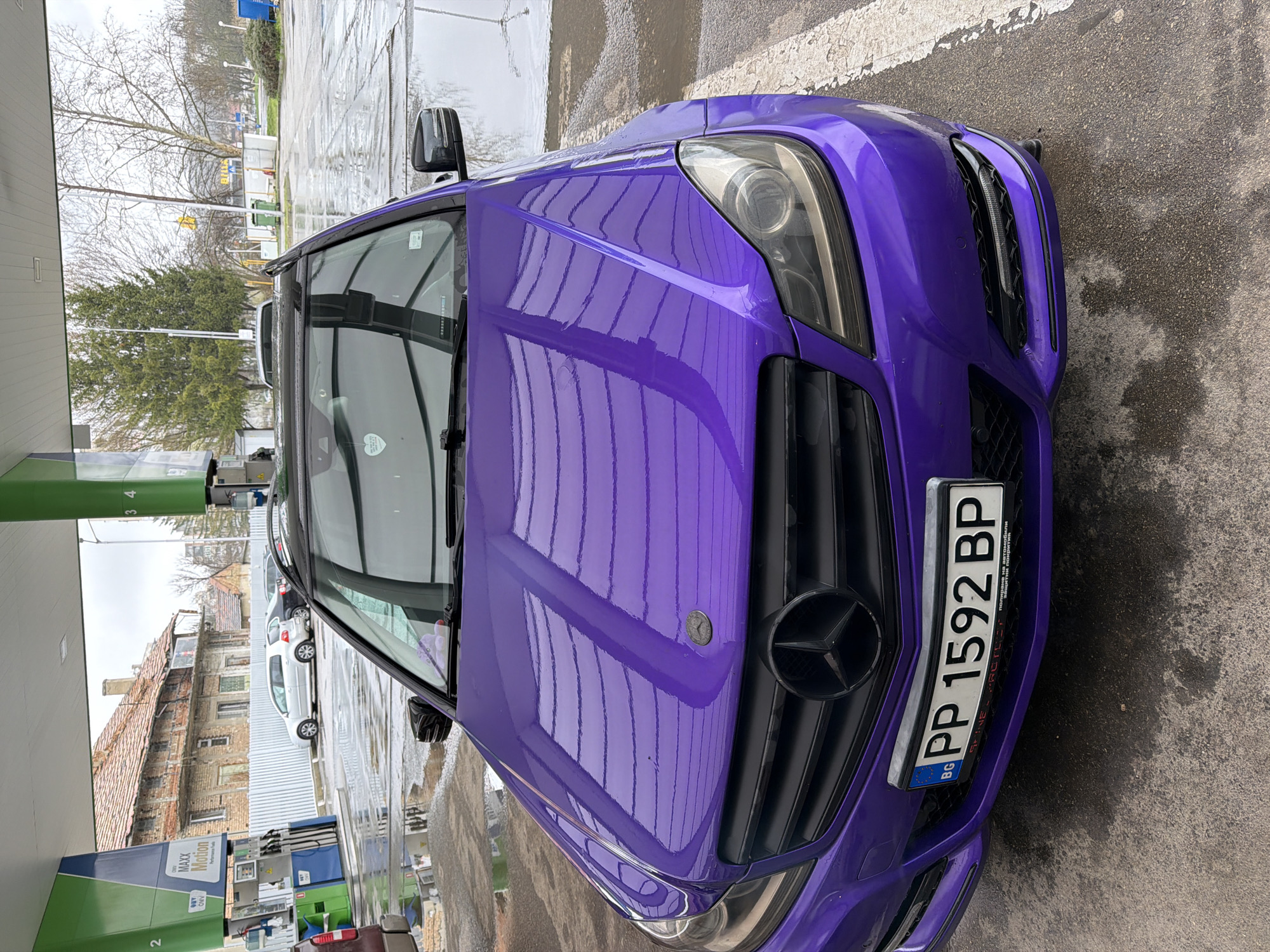 The image depicts a purple Mercedes-Benz parked at a gas station, likely in Razgrad, Bulgaria, as indicated by the license plate "PP 1592 BP" featuring the Bulgarian flag and registration code
