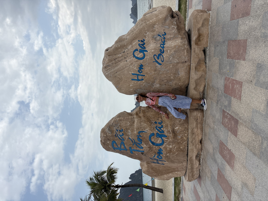 A single female subject stands on a paved walkway in front of two large, light brown rocks serving as a beach sign