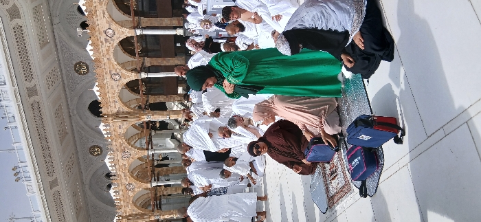 The image depicts an outdoor scene within the courtyard of the Masjid al-Haram (Grand Mosque) in Makkah Al Mukarramah, Saudi Arabia