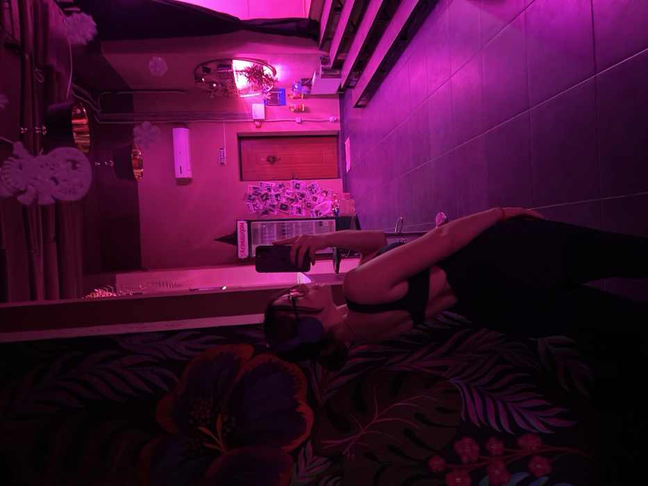 The image depicts an indoor scene in Lymanka, Ukraine, characterized by pervasive magenta artificial lighting. A female individual is positioned centrally to the left, actively taking a mirror selfie with a dark smartphone held in her right hand. She wears a dark sports bra with an open back, dark leggings, glasses, and blue over-ear headphones, with her back partially turned to the viewer and her head rotated to face her reflection. The wall immediately to her left (in the reflection) is adorned with a large mural featuring dark floral patterns. The reflected background on the right side of the room includes a black-framed commercial refrigerator, labeled "МОРОЗИВО" (Ice Cream) at the top and covered with numerous small square papers. To the right of the refrigerator is a red door, above which an air conditioning unit is mounted, and a "ВИХІД" (Exit) sign in Cyrillic is visible. Further to the right, a vertical oval mirror with integrated lighting displays internal plants, adjacent to a multi-tiered seating platform. The floor consists of dark tiles. The ceiling features exposed beams from which hang black and gold light fixtures and decorative white snowflake cut-outs.